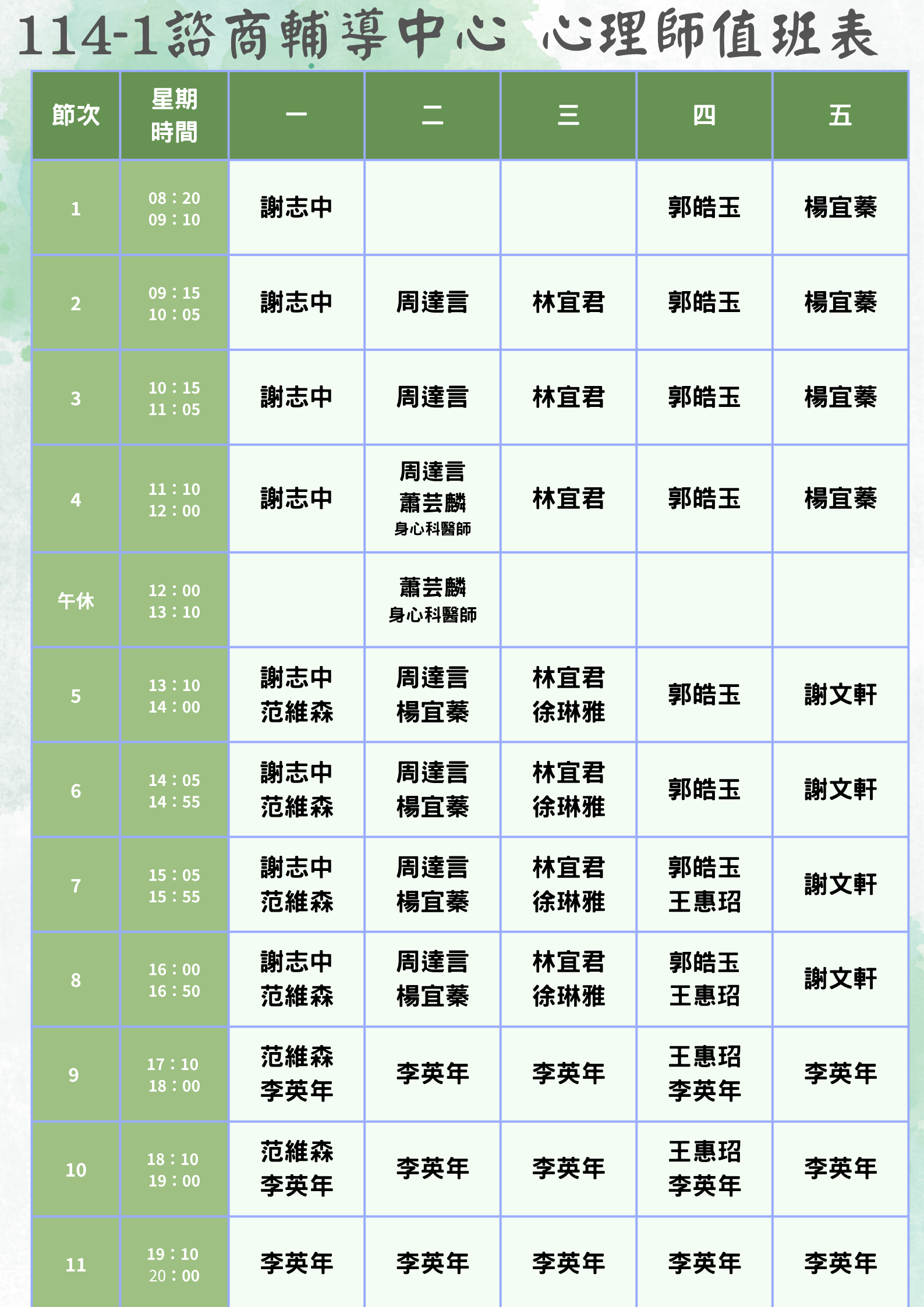 114-1專兼任輔導老師值班表