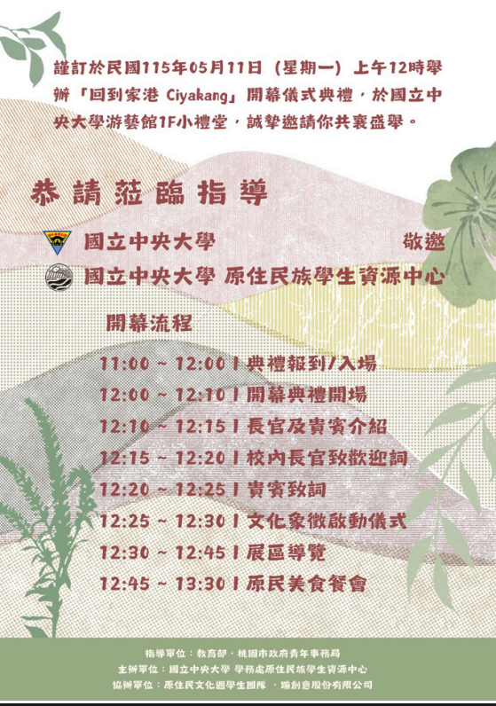 115/05/11-05/19 國立中央大學舉辦「115年全民原教-《回到家港 Ciyakang:我們一起說的故事》原住民族文化週開幕儀式」系列活動